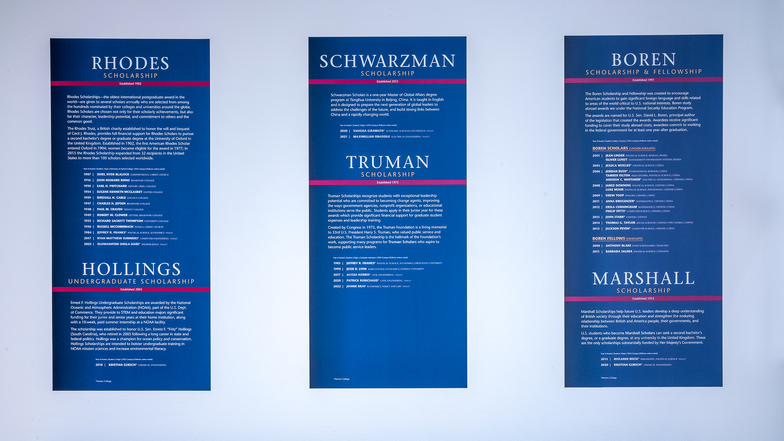 Right-hand view of the east wall of the gallery, which lists past recipients of Gilman, Goldwater, and Udall awards.